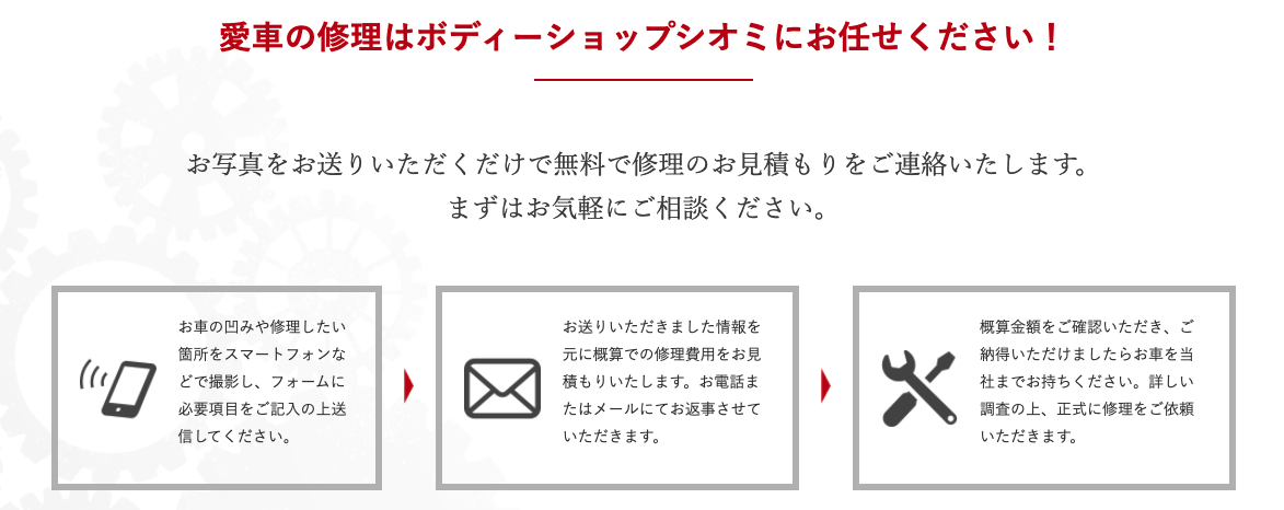 お車のキズなど、気になる部分をお写真に撮っていただき、お送りいただくだけでご利用いただけます。